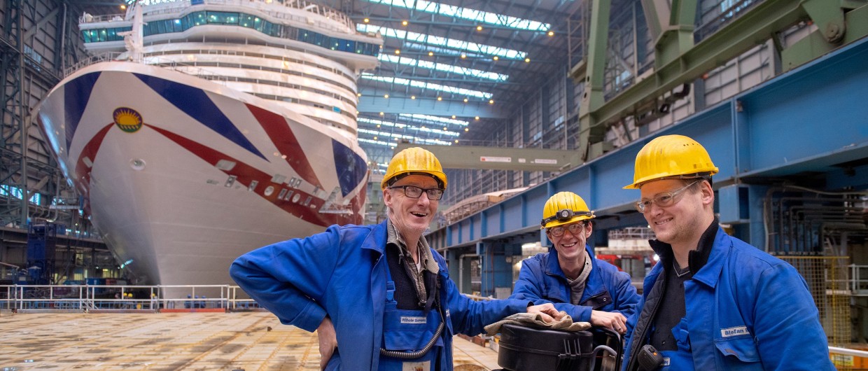 Das Team in Papenburg, das gemeinsam aktuell drei Kreuzfahrtschiffe im Jahr fertigstellt, ist auf 3625 Mitarbeiterinnen und Mitarbeiter gewachsen. Zusätzlich sind hunderte Lieferanten und Partnerfirmen mit tausenden Mitarbeitern beteiligt, bei denen die MEYER WERFT somit ebenfalls Beschäftigung sichert.