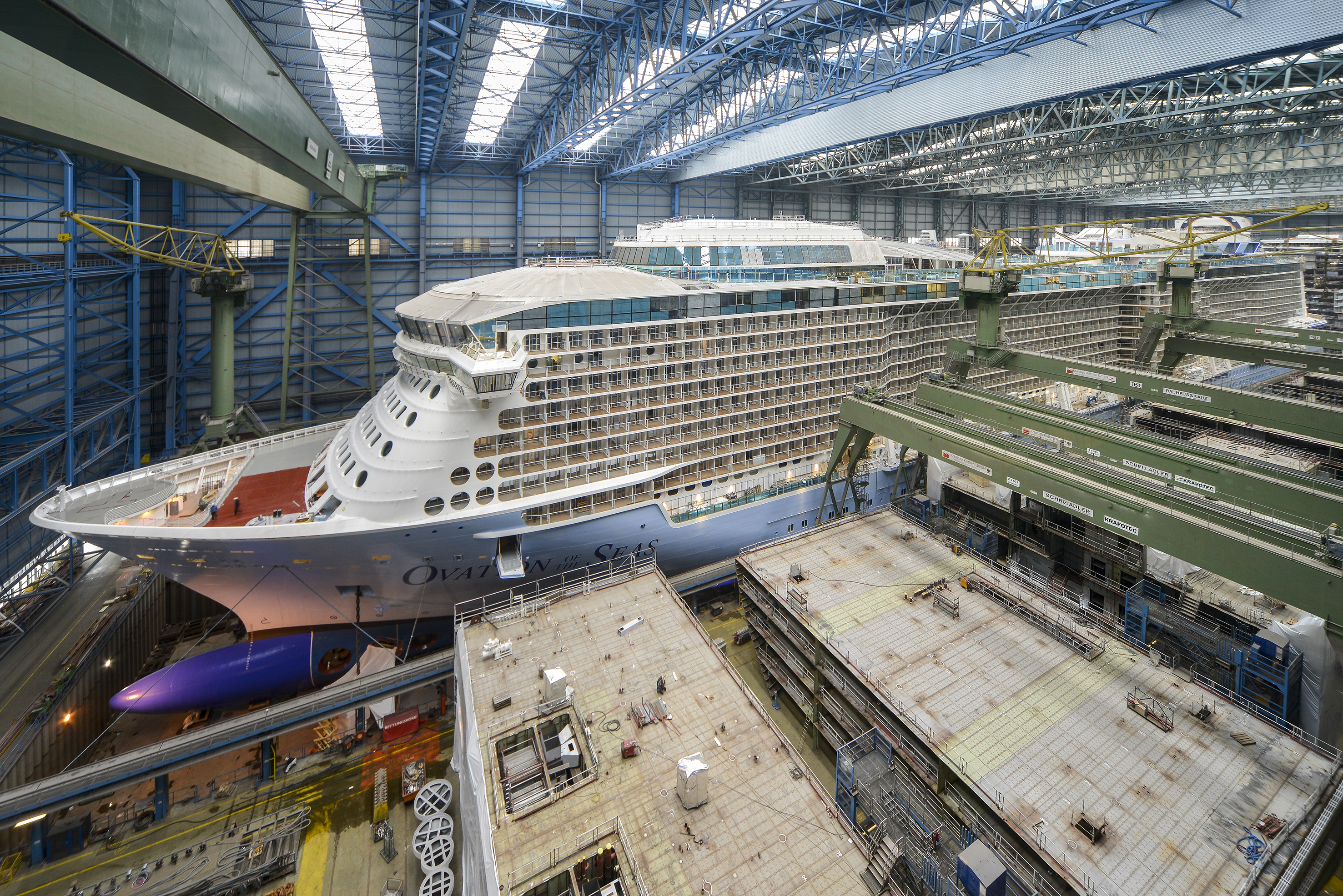 Am Donnerstag, den 18. Februar 2016 wird das mit 168.666 BRZ vermessene Kreuzfahrtschiff, S.699 Ovation of the Seas, das überdachte Baudock II der MEYER WERFT verlassen. Das Schiff ist wie seine beiden bereits abgelieferten Schwestern 347,75 Meter lang, 41,4 Meter breit und bietet 4188 Passagieren Platz.