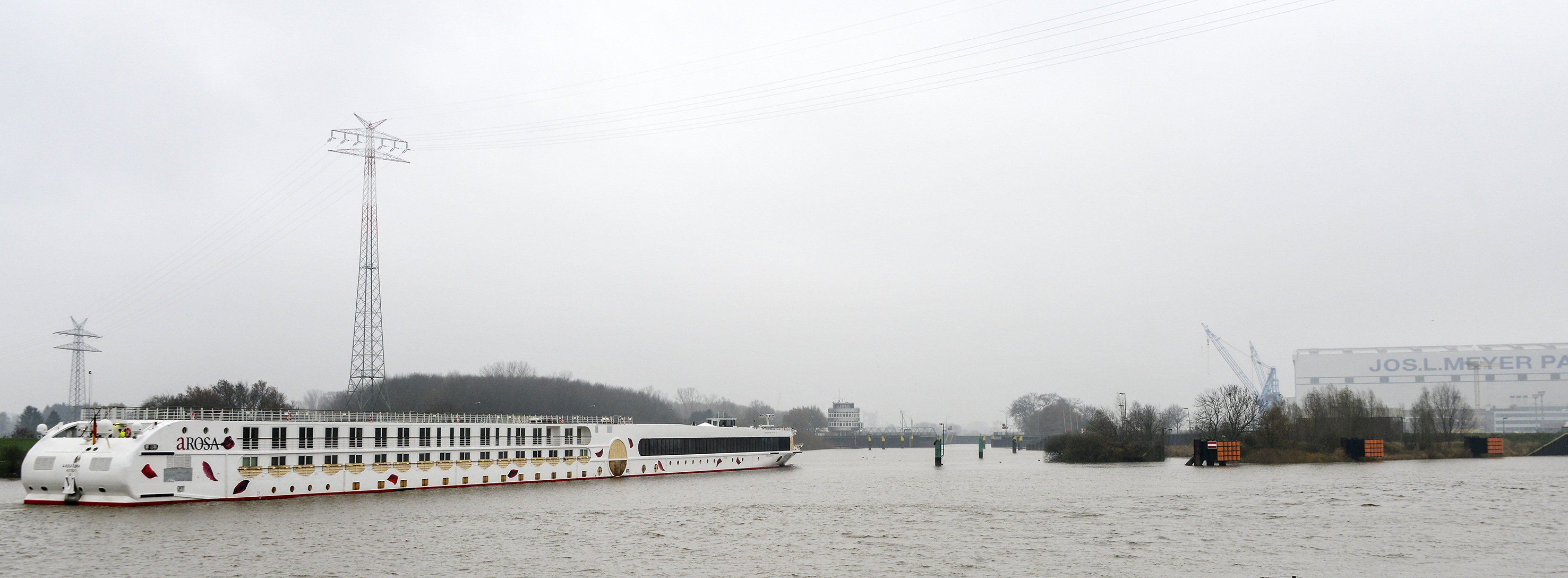 Papenburg/Rostock, 6. Dezember 2013 - Die auf der NEPTUN WERFT gebaute A-ROSA Flora hat sich in den letzten Tagen auf den Weg nach Papenburg gemacht, um an der MEYER WERFT zu überwintern. Am 4. Dezember kam sie in ihrem Winterquartier an und liegt jetzt Seite an Seite mit den Schiffen für Viking River Cruises.