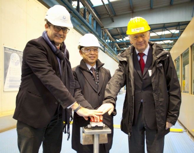 Colin Au, Advisor, Founding President and Chief Executive, Genting Hong Kong und Thatcher Brown, President, Dream Cruises drückten gemeinsam mit Bernard Meyer, Geschäftsführer Meyer Werft, den Startknopf der computergesteuerten Brennmaschine und setzte damit die Bearbeitung der ersten Stahlplatte für das neue Kreuzfahrtschiff in Bewegung. Die Fertigstellung des zweiten Schiffes für Dream Cruises ist für Herbst 2017 geplant. Das Schwesterschiff die Genting Dream wird im Herbst 2016 abgeliefert.