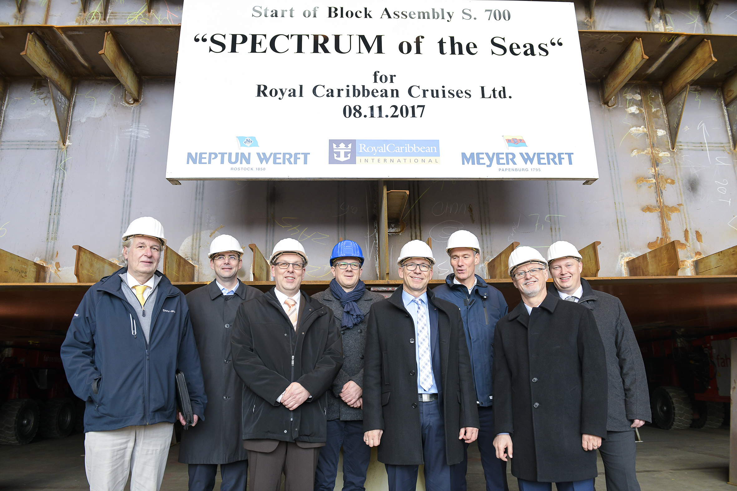 An der Kiellegung nahmen von der MEYER WERFT Thomas Weigend, Stephan Schmees (Geschäftsleitung) und Carsten Pengel (Projektmanagement), von der NEPTUN WERFT Raimon Strunck (Geschäftsführer) und Mathias Kopitzki (Projektleiter) sowie das Team von Royal Caribbean International und Thomas Murken von der Klassifikationsgesellschaft DNV GL teil. „Wir freuen uns sehr, diese innovativen Schiffe für Royal Caribbean zu bauen und unsere langjährige Geschäftsbeziehung weiterführen zu können”, sagte Stephan Schmees.