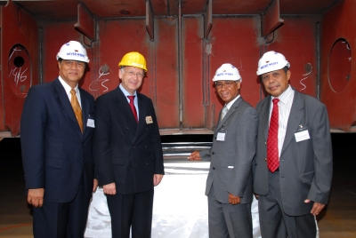 Papenburg, 2. Juli 2007 - Auf der MEYER WERFT wurde jetzt der erste Block von insgesamt 18 Blöcken des neuen 14.200 BRZ großen Passagierschiffes für Indonesien, die Gunung Dempo, ins Baudock I der MEYER WERFT gehoben. Mr. Wendy Aritenang Generalsekretär im indonesischen Transportministerium, legte den traditionellen Glückscent auf die Pallungen, bevor der 600-Tonnen-Kran diesen Block des neuen Schiffes absetzte. Dieses erste Bauteil, ein Doppelboden, wiegt ca. 133 Tonnen, ist 14 Meter lang und 20,00 Meter breit.