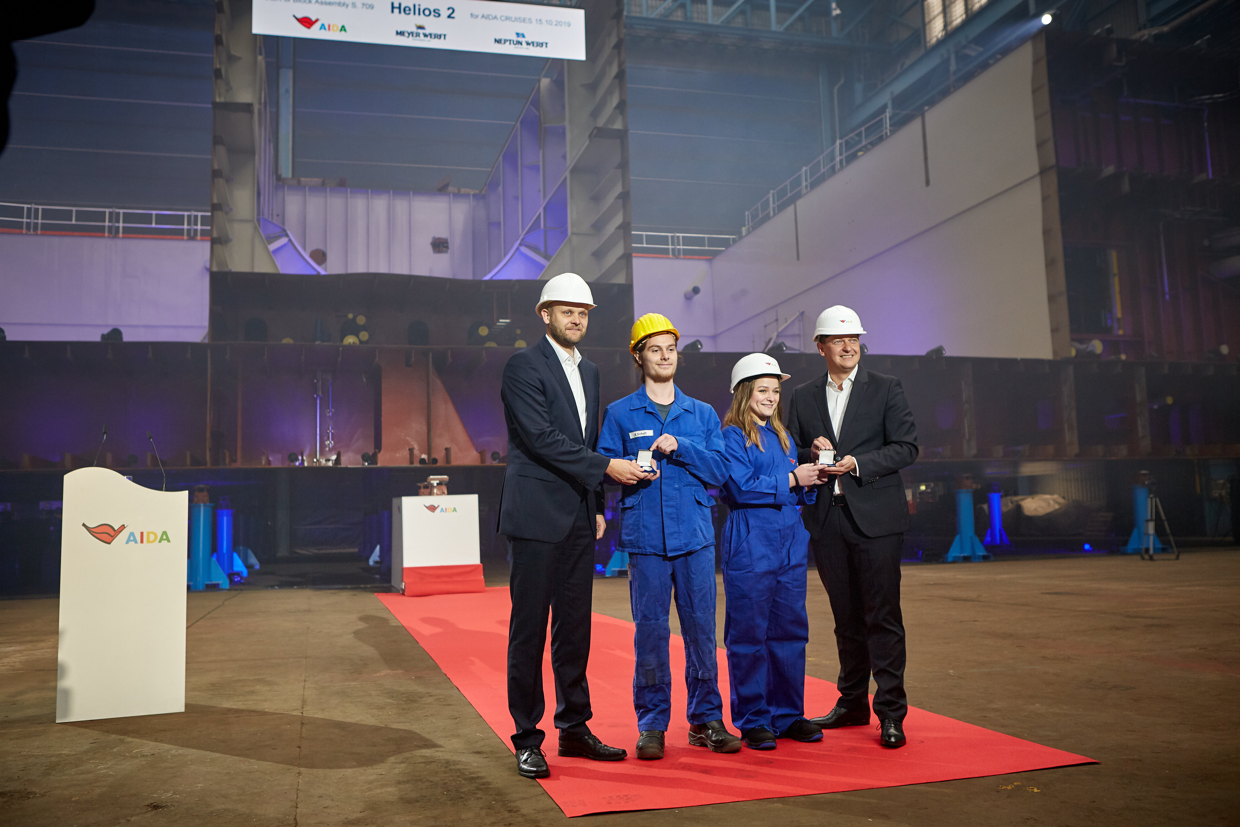 Rostock, 15. Oktober 2019 – Bereits zum zweiten Mal im Jahr 2019 ist mit der AIDAcosma auf der NEPTUN WERFT in Rostock-Warnemünde ein Kreuzfahrtschiff auf Kiel gelegt worden. Am Dienstag wurde mit der traditionellen Zeremonie die nächste Bauphase für das zweite Schiff der Helios-Klasse eingeläutet. Erstmals erfolgte die Kiellegung eines AIDA-Schiffes in Rostock, das auch Firmensitz von AIDA Cruises ist.