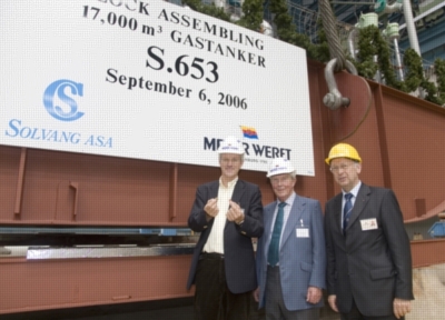 Papenburg, 06.09.2006 - Am heutigen Mittwoch wurde der erste von vier Gastankern für Reederei Solvang ASA auf der MEYER WERFT in Papenburg auf Kiel gelegt. Bei der Clipper Hebe, dem ersten Schiff dieser Serie, legte Magne Morken für die Reederei Solvang ASA den traditionellen Glückscent unter den ersten von insgesamt 18 Blöcken. Die Ablieferung des ersten Neubaus dieser Serie ist für Sommer 2007 vorgesehen.