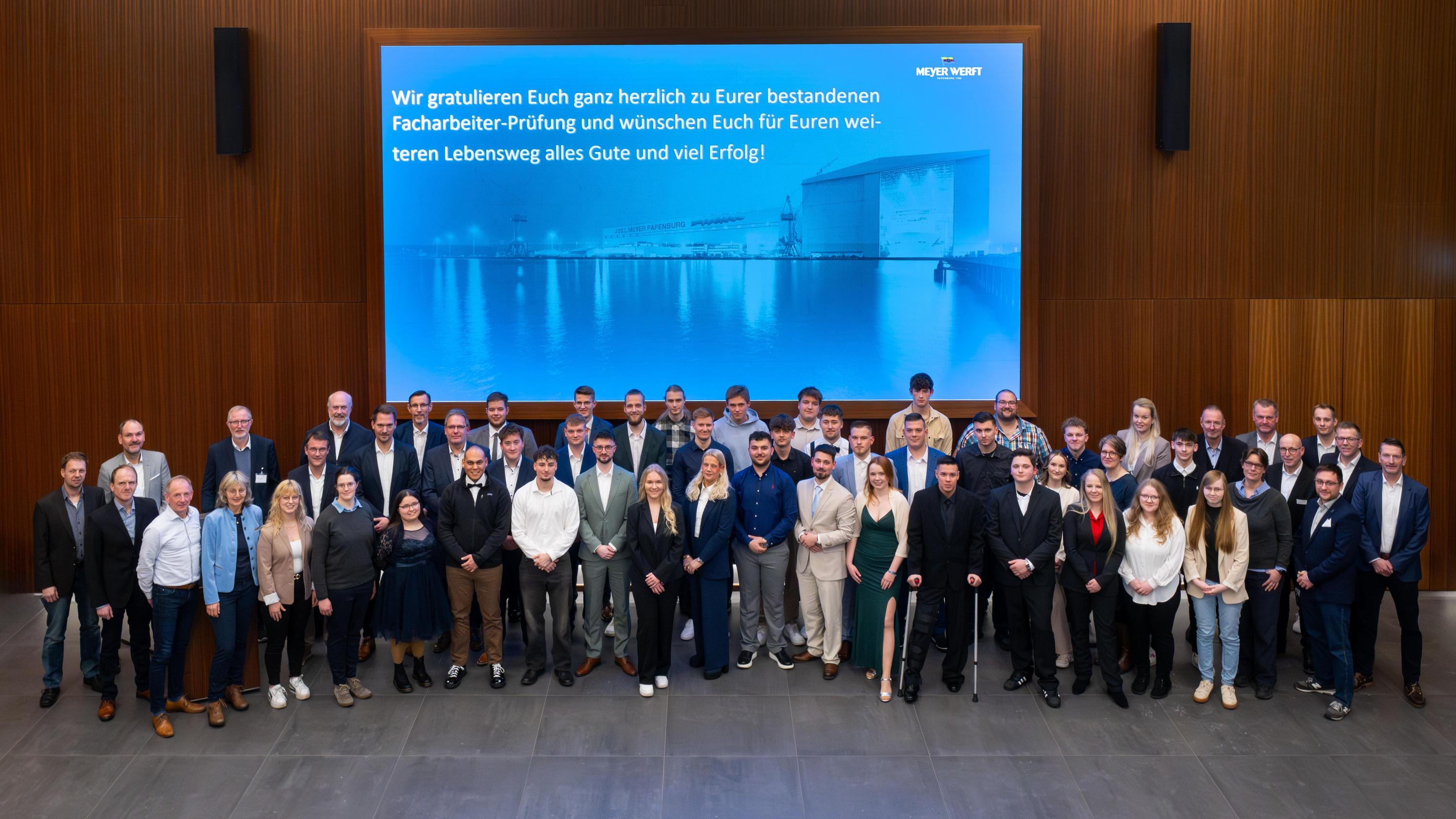 Gute Nachrichten für die 34 Auszubildenden der MEYER WERFT, von EMS PreCab, RE Interior und ND Coatings, die am Mittwochabend ihre Abschlusszeugnisse in einem feierlichen Rahmen auf der Werft erhielten: Alle sind ab sofort als Facharbeiterinnen und Facharbeiter in den Betrieben tätig und haben einen Arbeitsvertrag in der Tasche. „Ein starker Jahrgang“, befand Jörg Heidelberg, COO der MEYER WERFT bei seiner Rede an die neuen Fachkräfte.