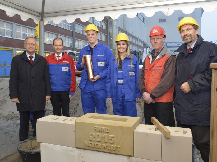 Grundsteinlegung durch zwei Auszubildende der Meyer Werft