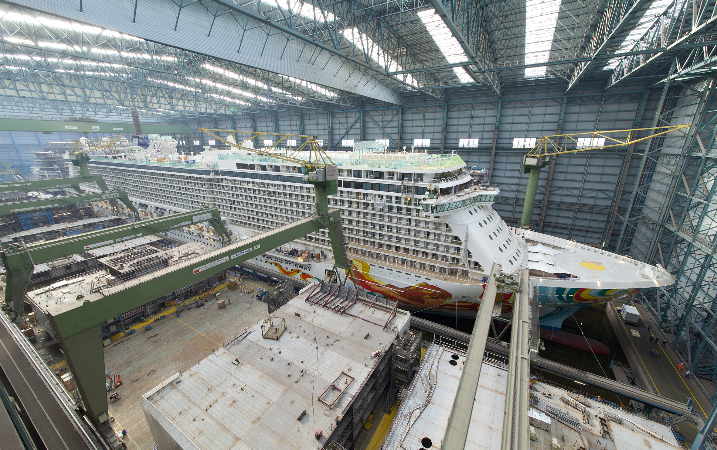Foto/Bildunterschrift: Norwegian GETAWAY derzeit noch im Baudock II der Papenburger MEYER WERFT.
