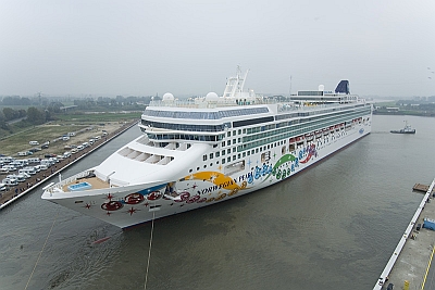 Papenburg, 14. Oktober 2006 - Nach Abschluss umfangreicher Tests und Maschinenerprobungen verlässt das 93.500 BRZ große Kreuzfahrtschiff "Norwegian Pearl" Sonntag das überdachte Baudock der MEYER WERFT. Anschließend werden dann die bereits vorgefertigten Maschinenraummodule für das nächste NCL-Schiff, die "Norwegian Gem", in das Baudock verholt, wo schon das Vorschiff wartet.