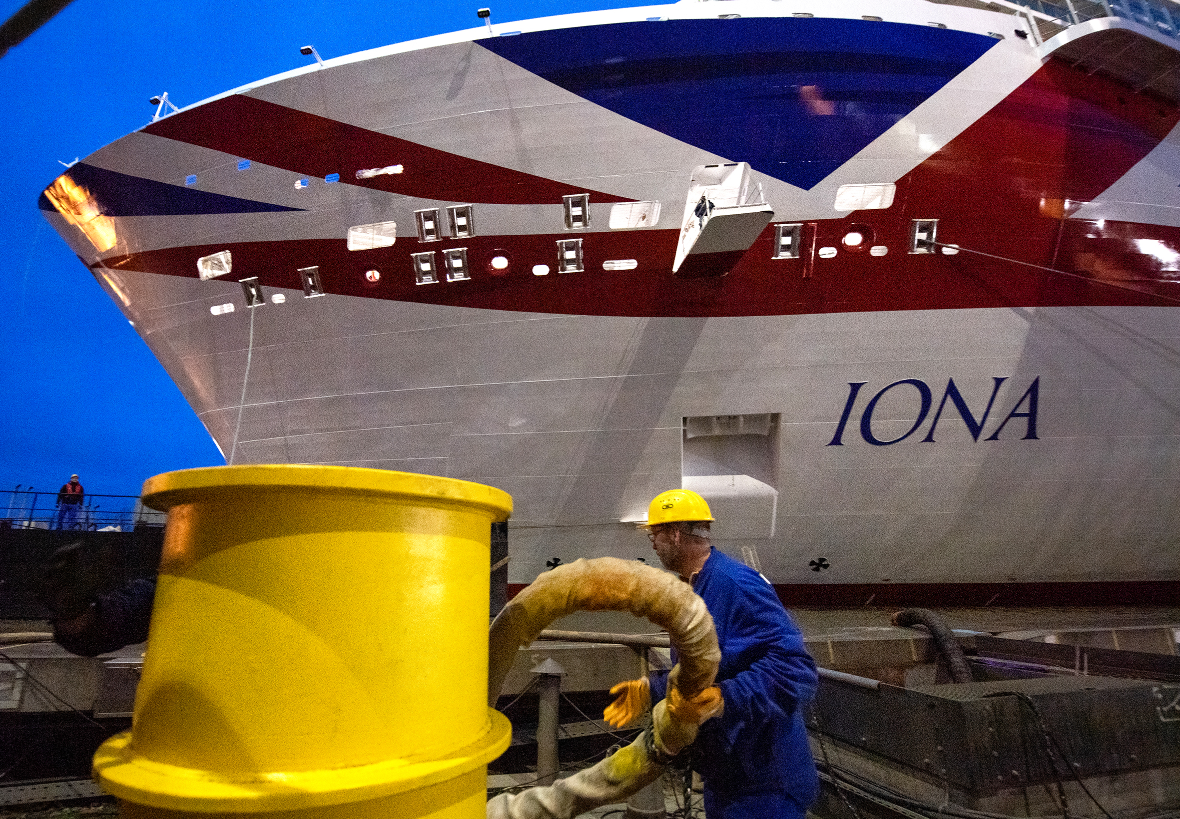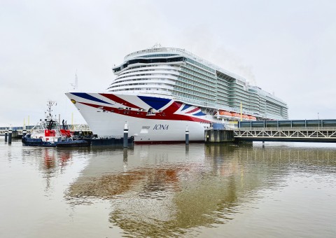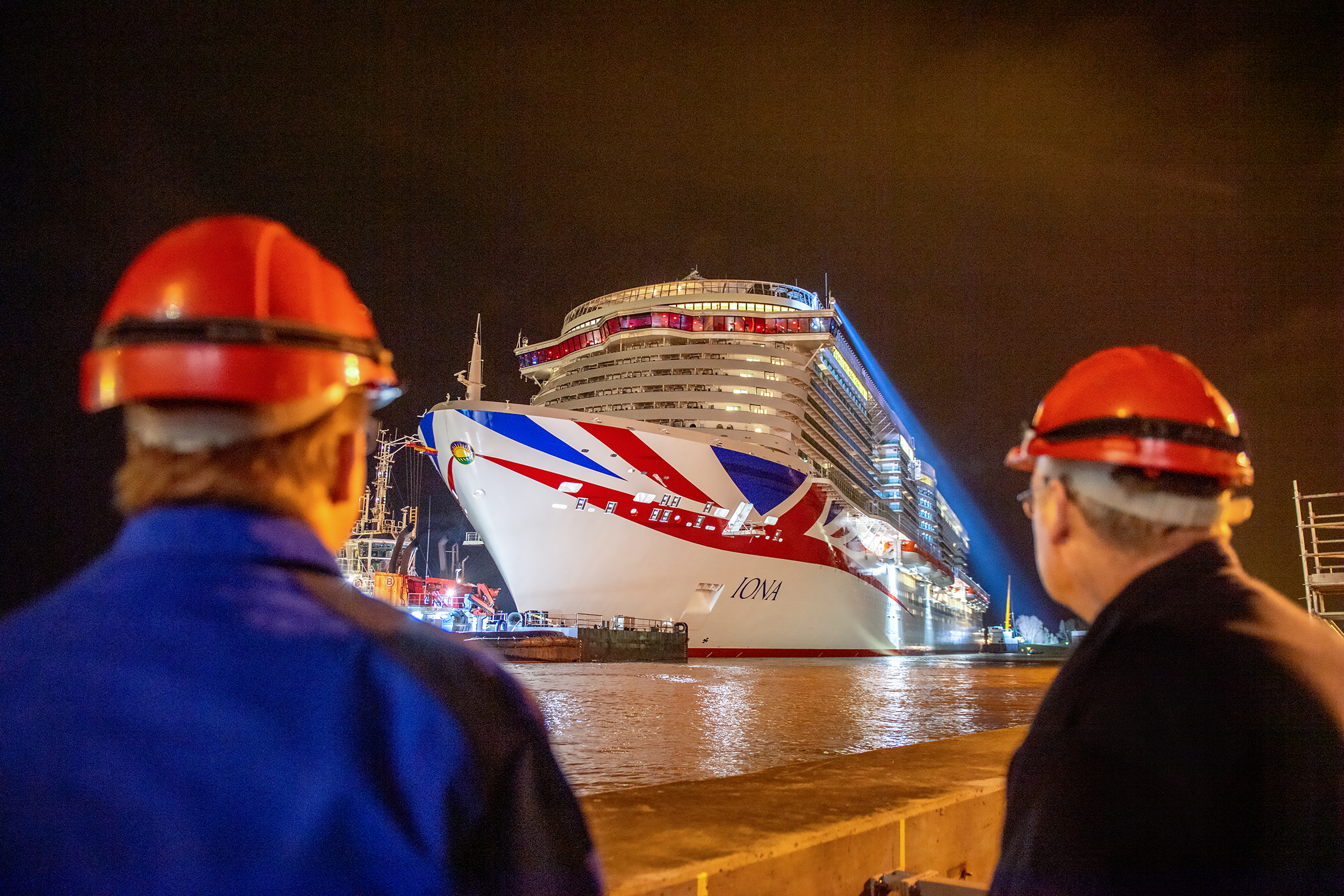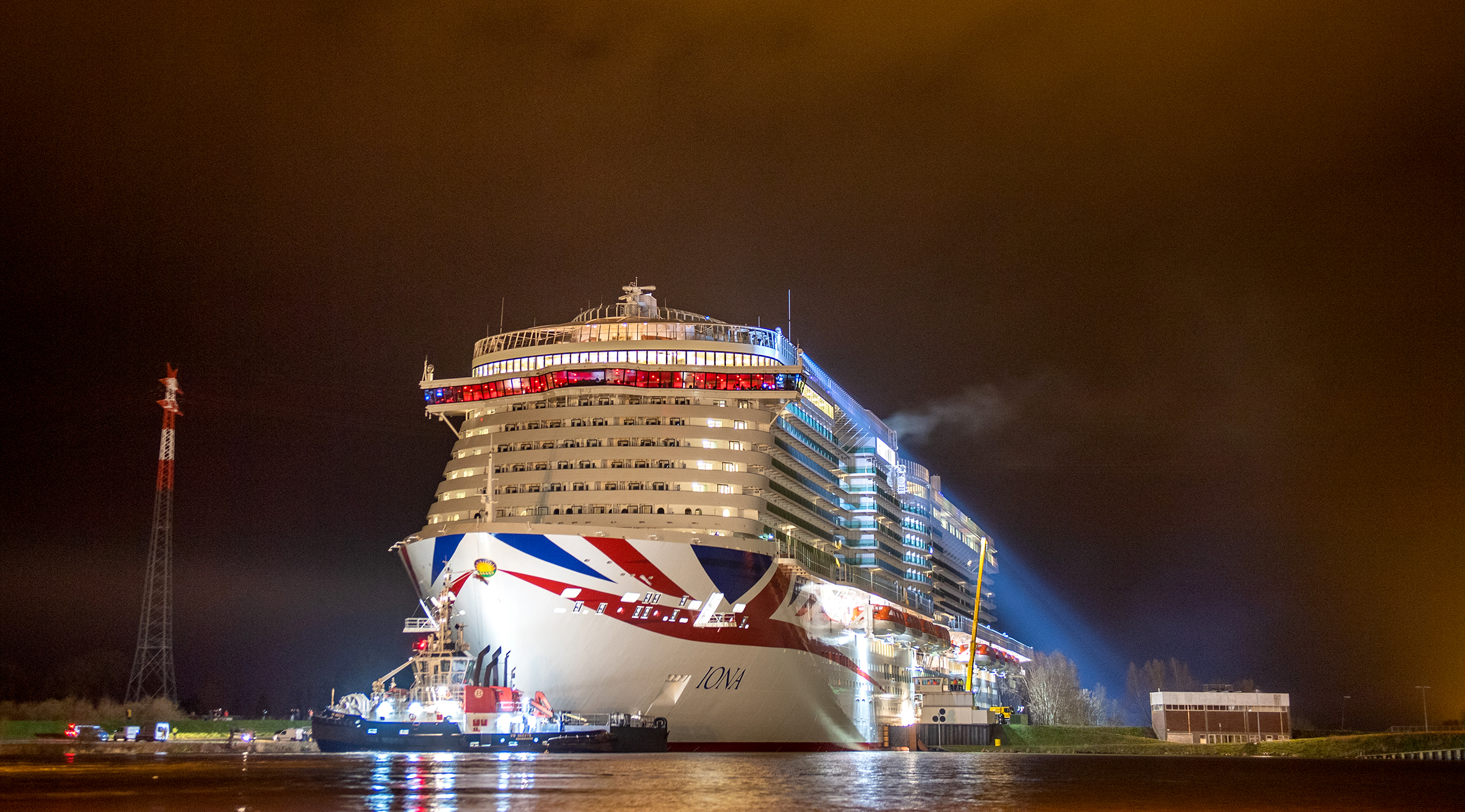The new cruise ship for British P&O Cruises, Iona, will probably leave Papenburg on Wednesday, March 18 2020 to be conveyed on the river Ems to Eemshaven (NL). The ship is planned to arrive in Eemshaven on Thursday evening. Later on the ship will go through several days of technical and nautical sea trials on the North Sea.