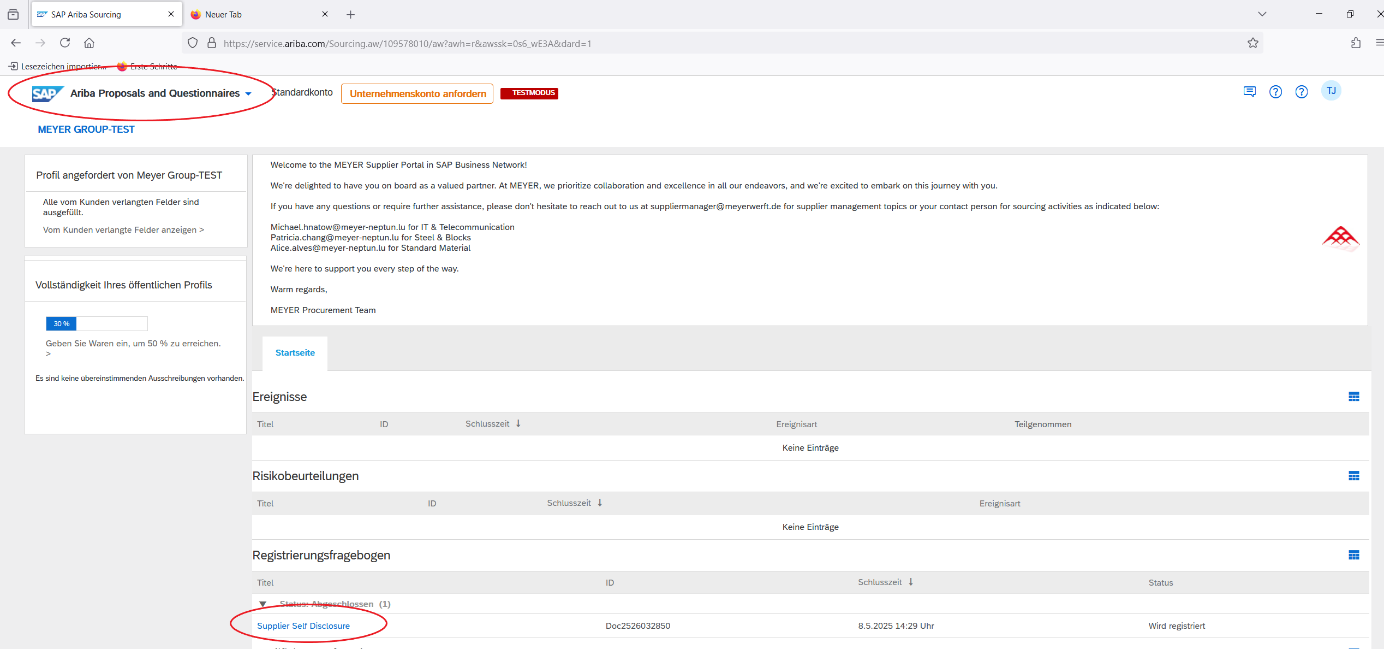 Our supplier management team is happy to support you with the SAP Ariba registration. We can schedule an appointment to work on the registration together, either online or in person. Please contact: supplier.manager@meyerwerft.de